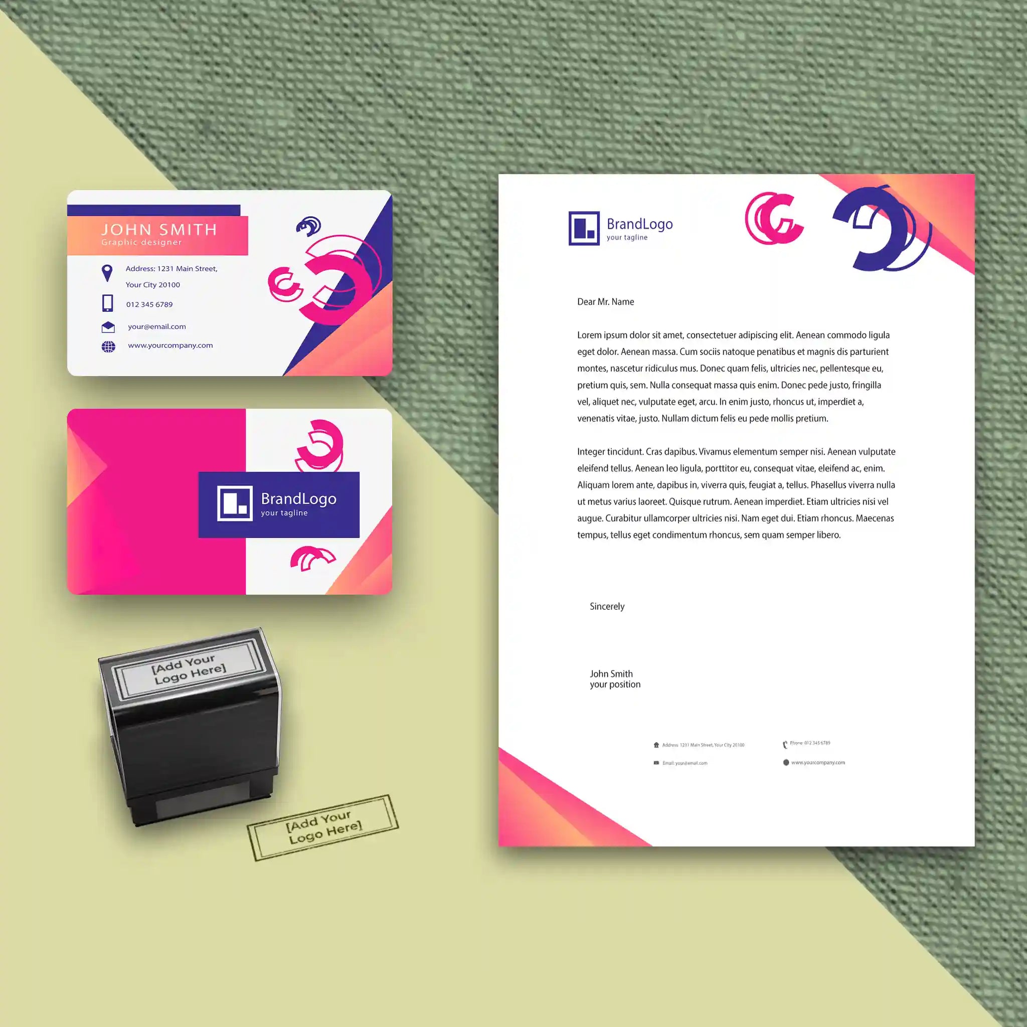 Make a bold statement with this Pink & Purple Stationery Set, designed for graphic designers, agencies, and modern professionals. This vibrant kit ensures a strong, cohesive brand identity with its sleek, dynamic design.
