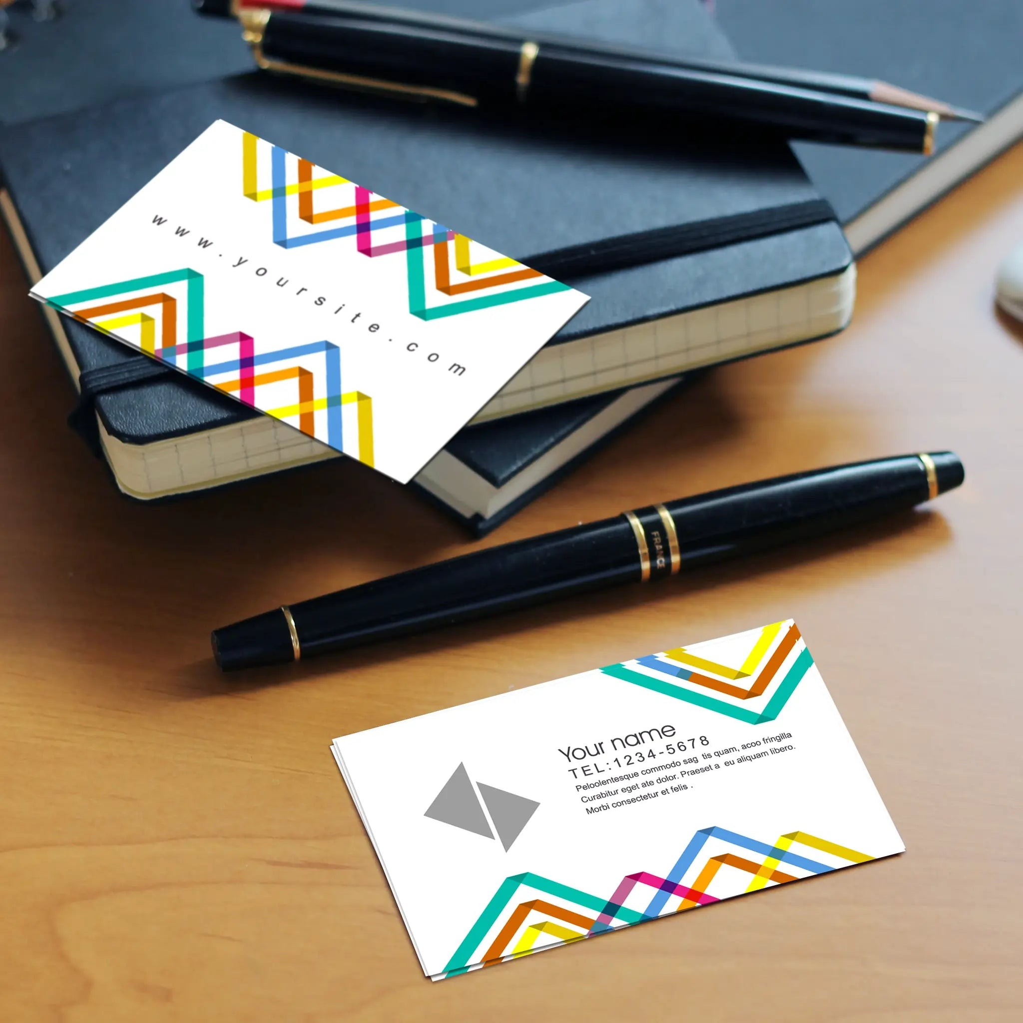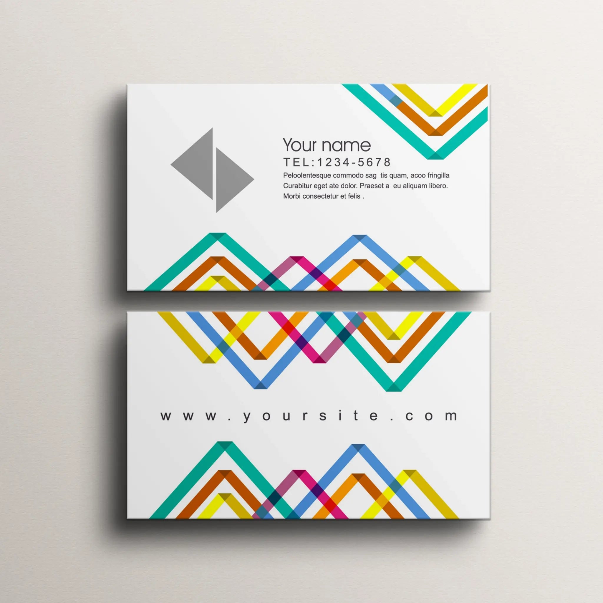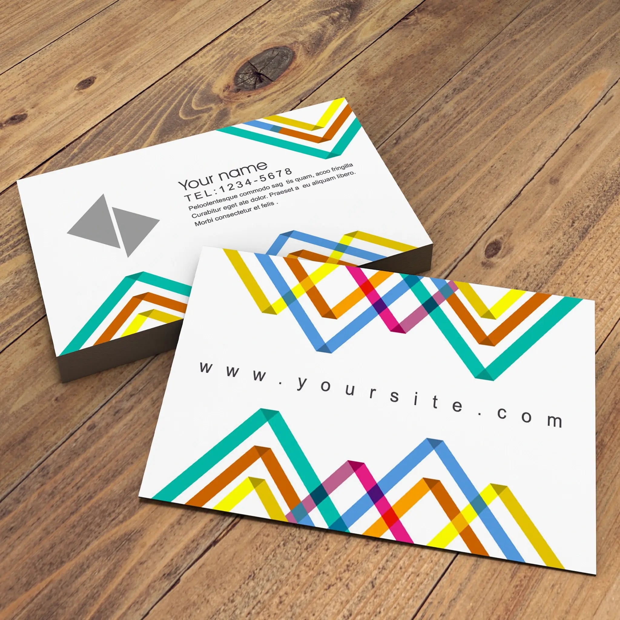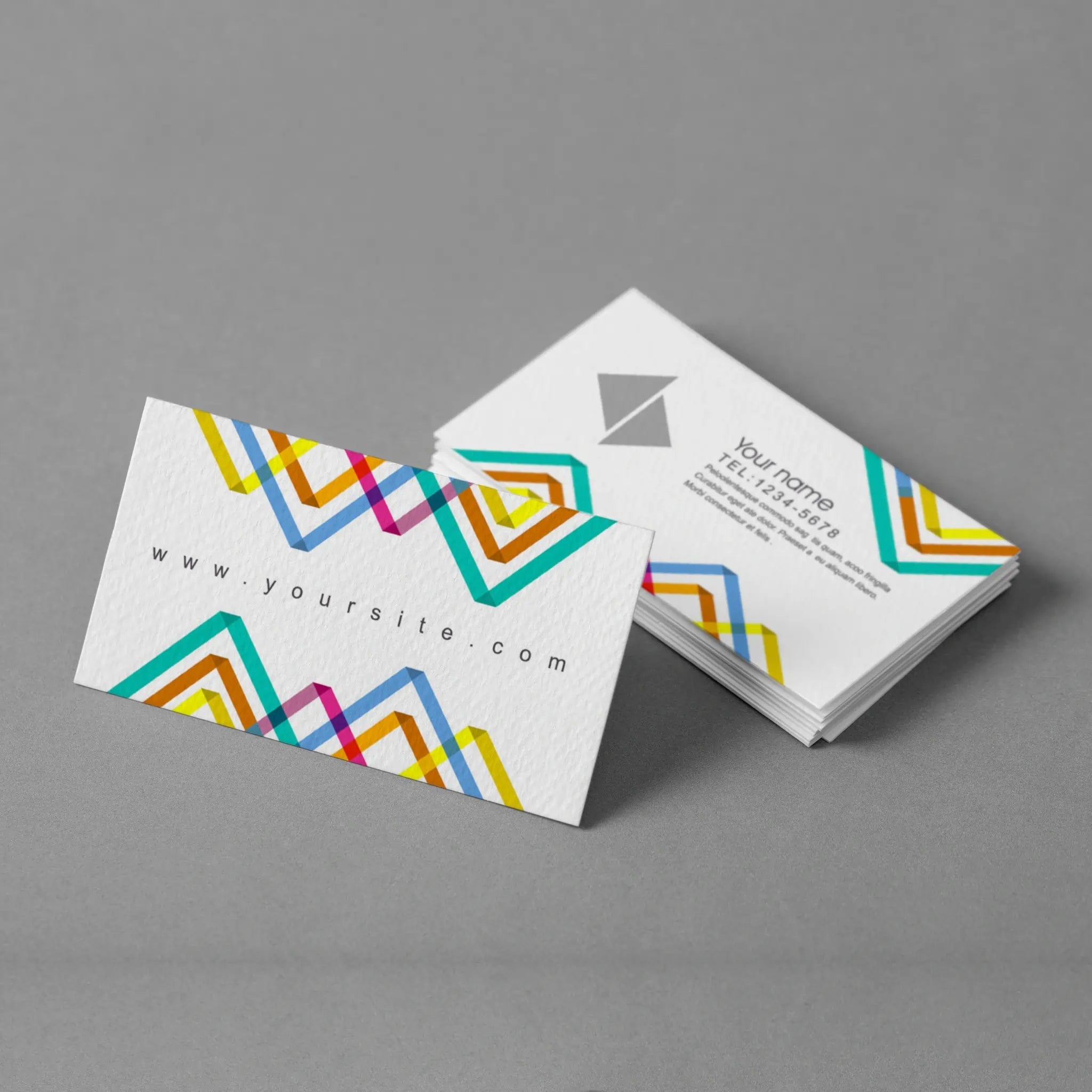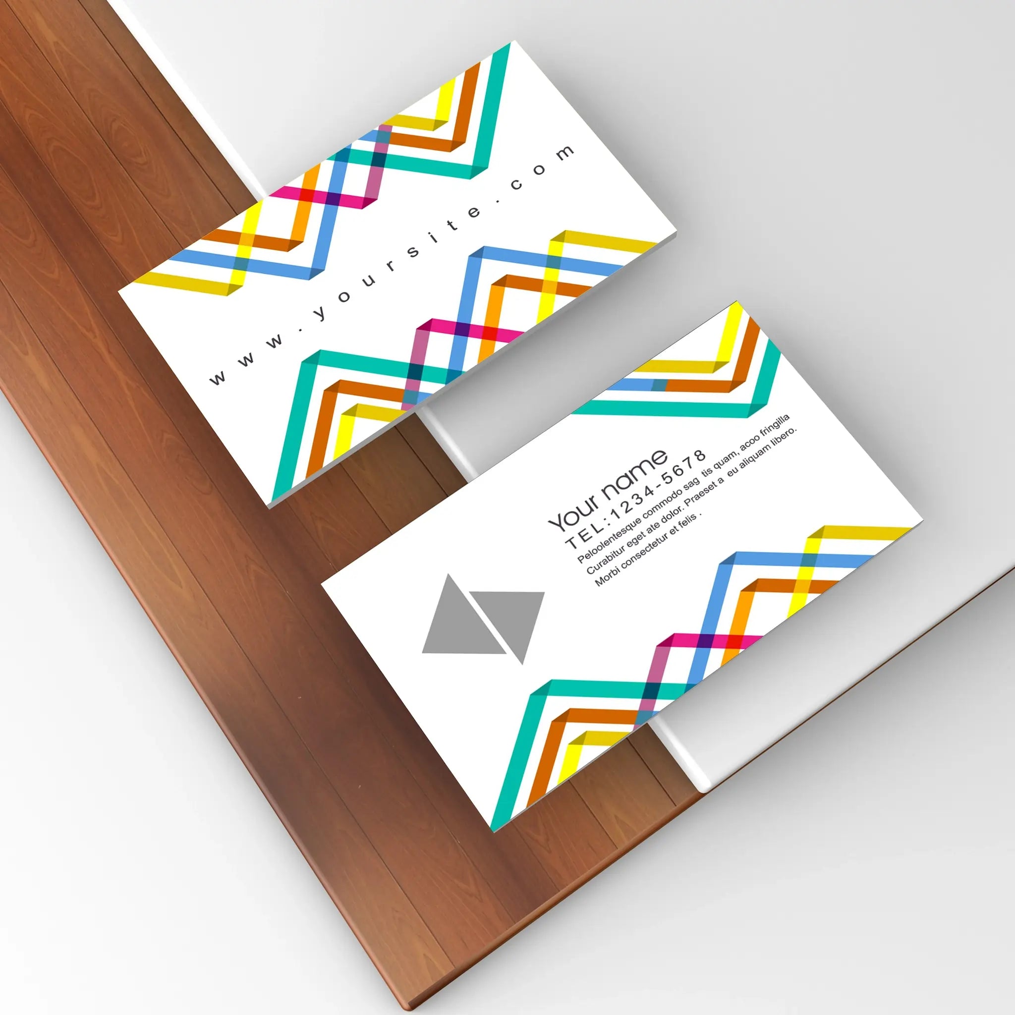 Stand out with these vibrant geometric business cards, featuring a modern and colorful design on a sleek cream background. Perfect for creatives, agencies, startups, and professionals who want a fresh and contemporary look.