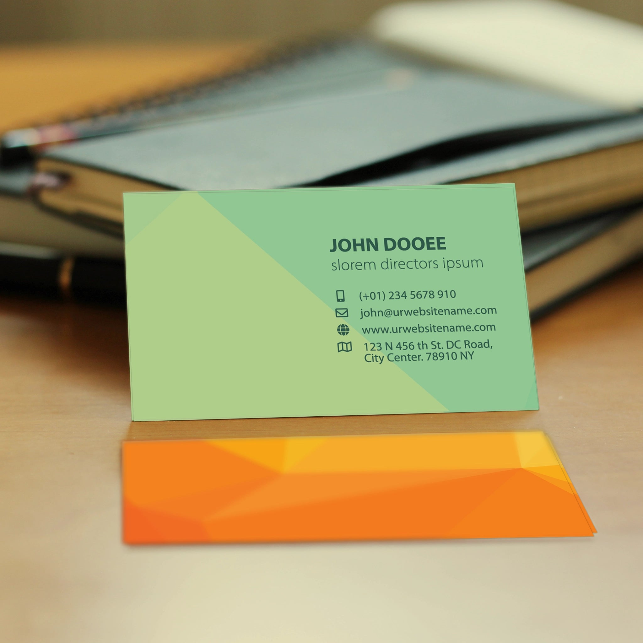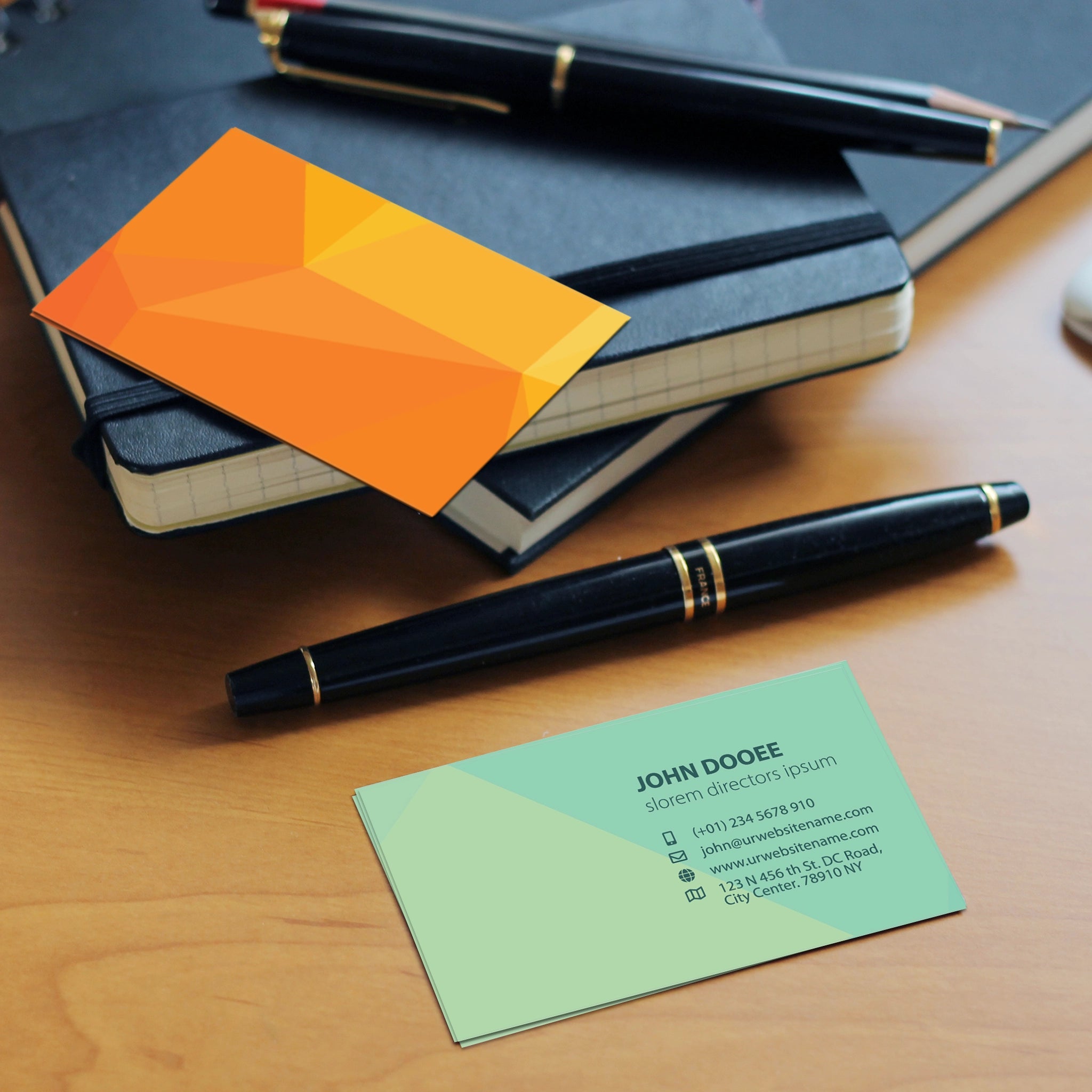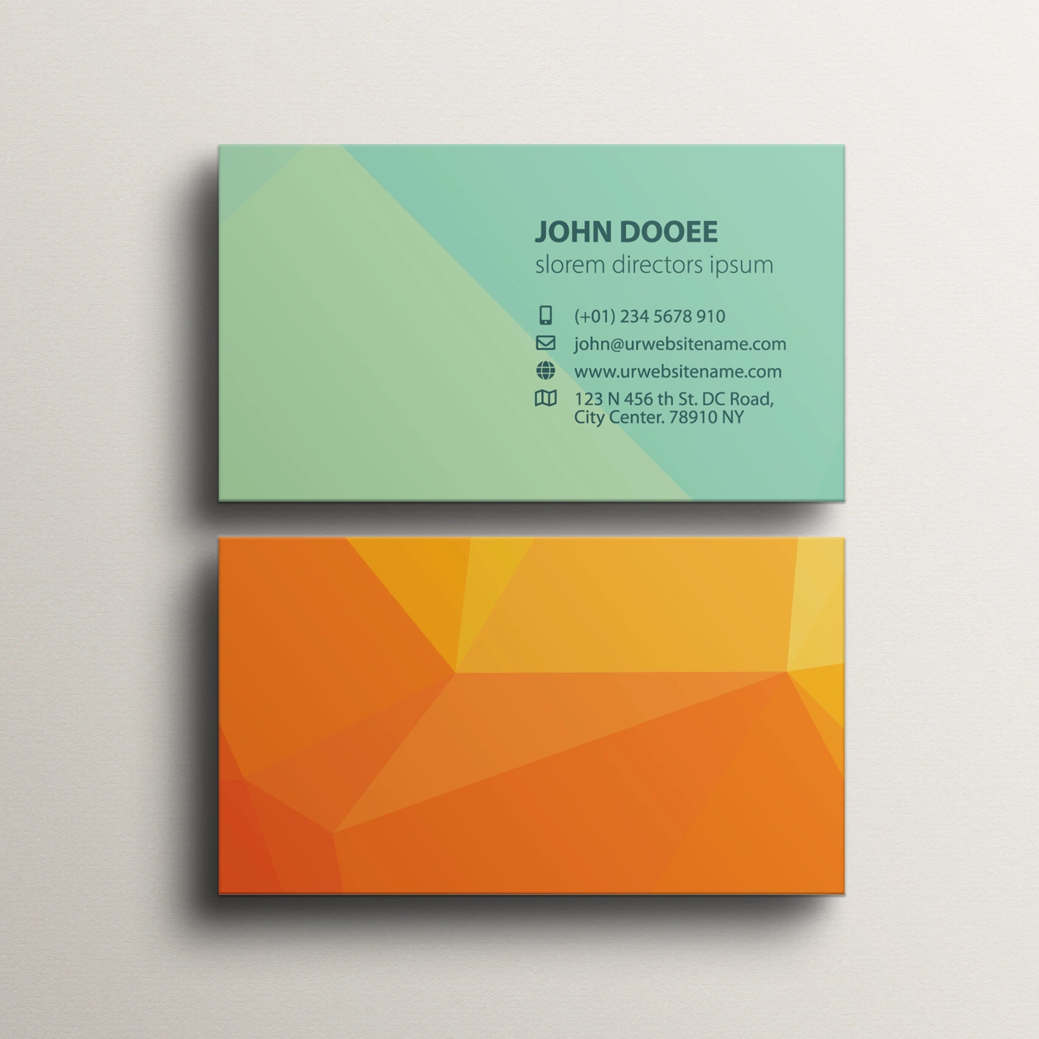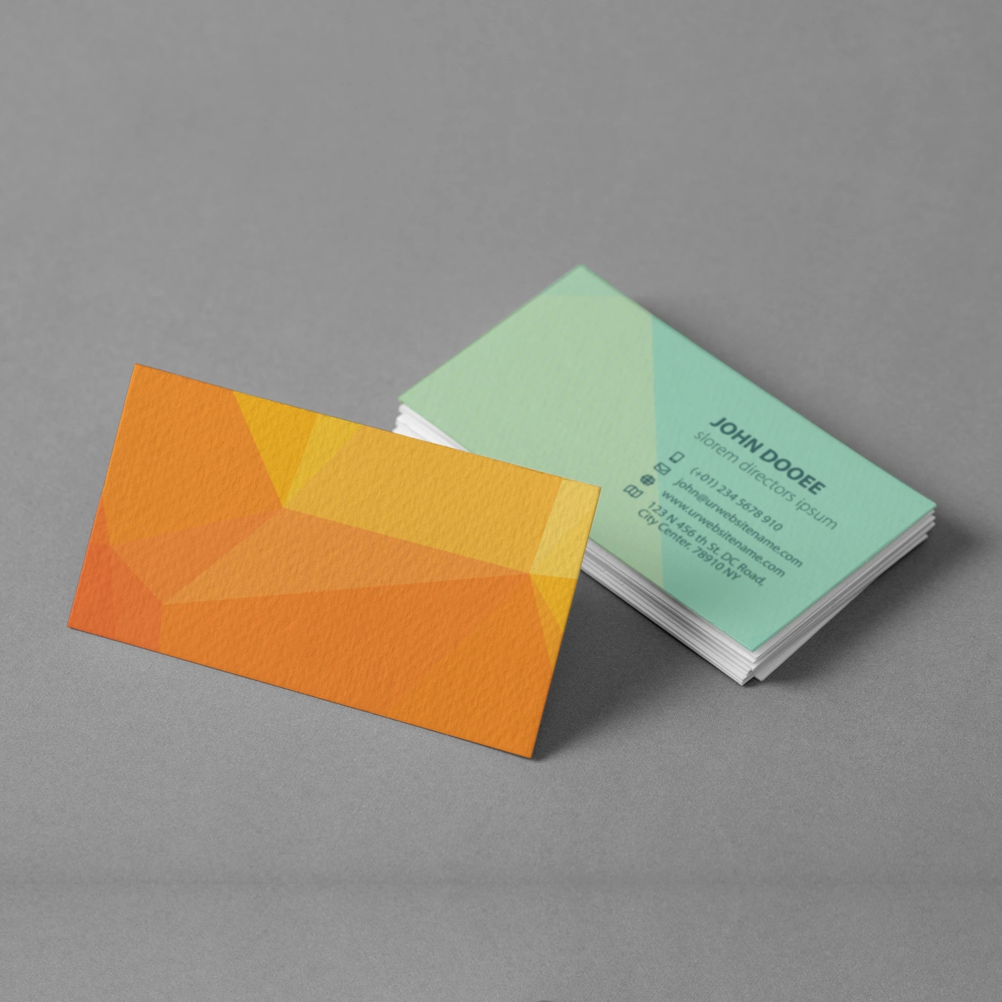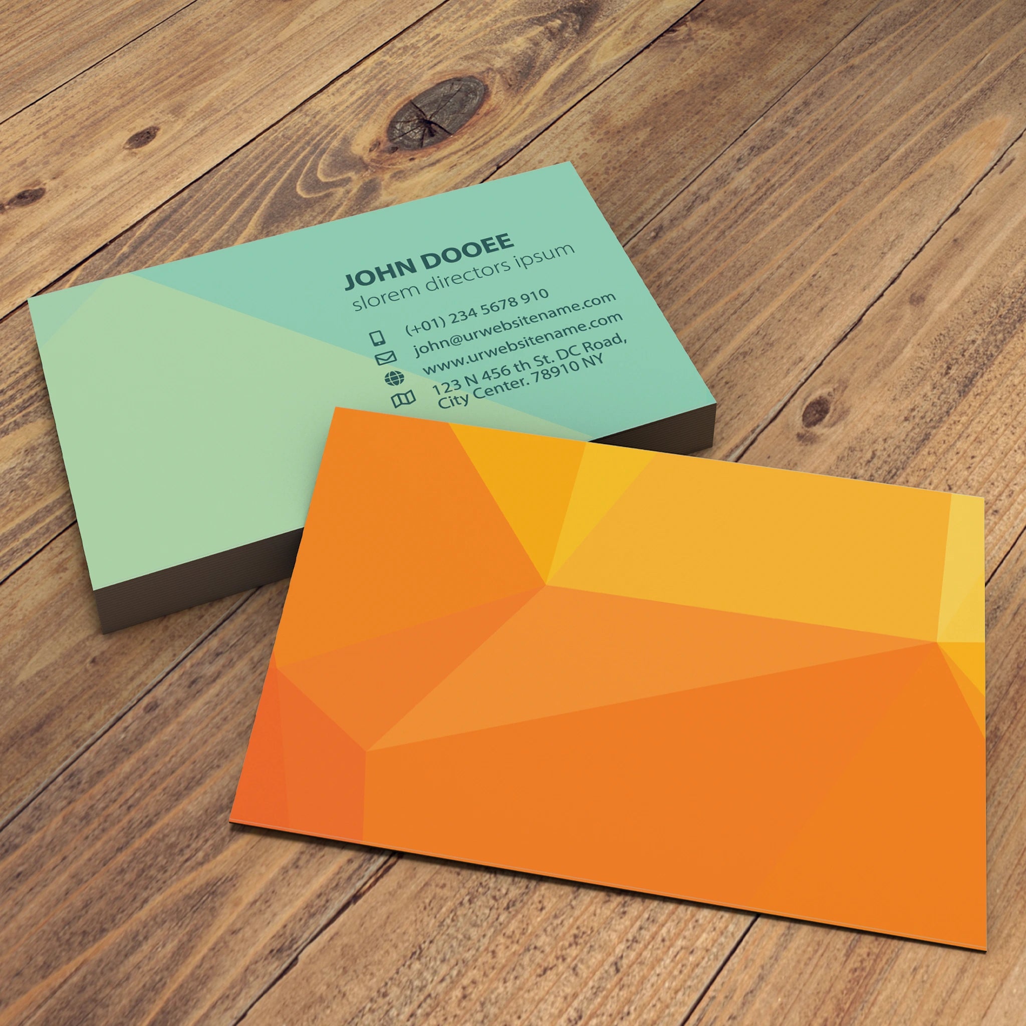 Make a lasting impression with these modern business cards, featuring a soft green front with a geometric layout and a bold orange polygonal back. Ideal for creative professionals, entrepreneurs, and businesses looking for a fresh and professional look.